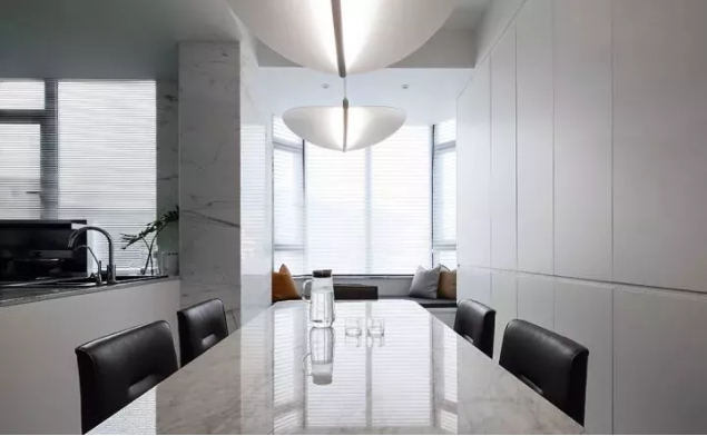 開放式客餐廳延續(xù)了簡(jiǎn)約利落的格調(diào),在材質(zhì)搭配上以大理石、玻璃和金屬為主。大面積的落地窗引入自然光線,使整個(gè)空間更加通透大氣,巧妙地演繹出和緩舒適的空間節(jié)奏。