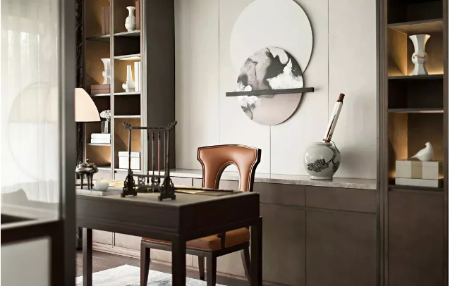 繞過屏風(fēng),客廳后面還有一個(gè)小書房。墻上的裝飾圖案成為視覺的焦點(diǎn),其他地方有序展開的筆墨紙硯、瓷器盆景、屏風(fēng)、博古架等,為主人營(yíng)造了一個(gè)寧?kù)o致遠(yuǎn)的世界。