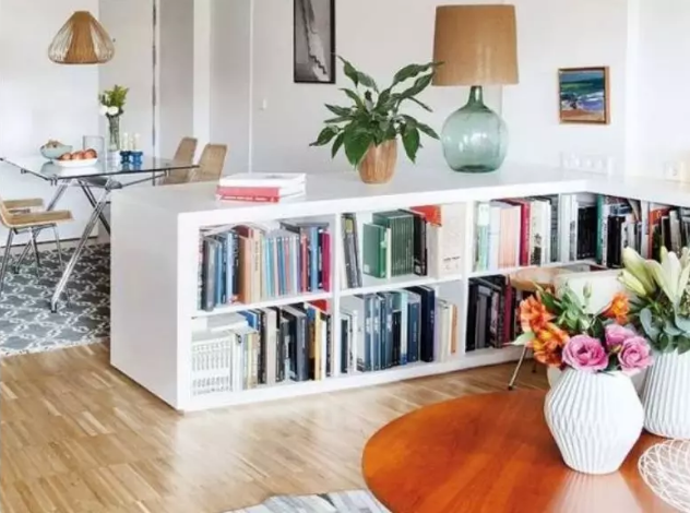 餐廳和客廳之間放個(gè)矮柜也能藏書(shū)。伸手想拿遙控器?還是先看幾頁(yè)書(shū)吧!