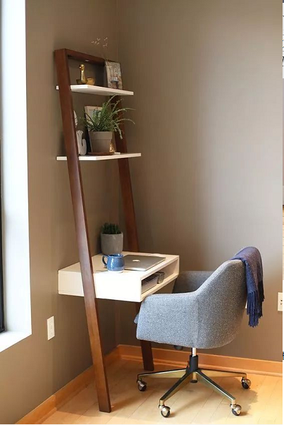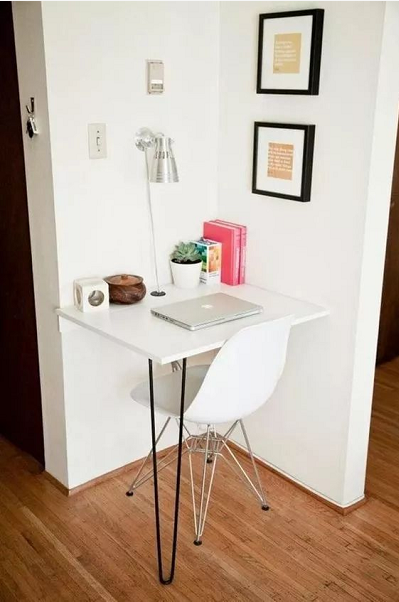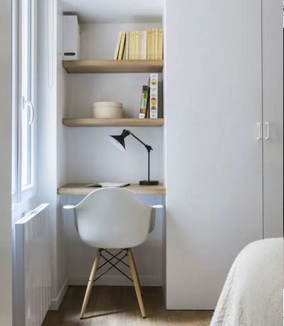 因?yàn)槌叽鐔?wèn)題,房間即使定制裝修,也難免出現(xiàn)沒(méi)利用好的死角,利用小桌板+擱板架,就能將空間榨到極致。