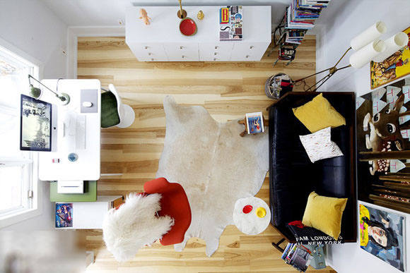 以不同的視覺俯瞰我們常年居住的空間,會(huì)獲得另外一種視覺感受。方形空間,沙發(fā)、邊柜、書桌都有序擺放,有緊有散,不會(huì)產(chǎn)生壓抑感。大大的玻璃窗讓陽(yáng)光投射進(jìn)來,白色為基礎(chǔ)的空間更為膨脹,清爽木色融入,點(diǎn)燃空間明媚氣氛。