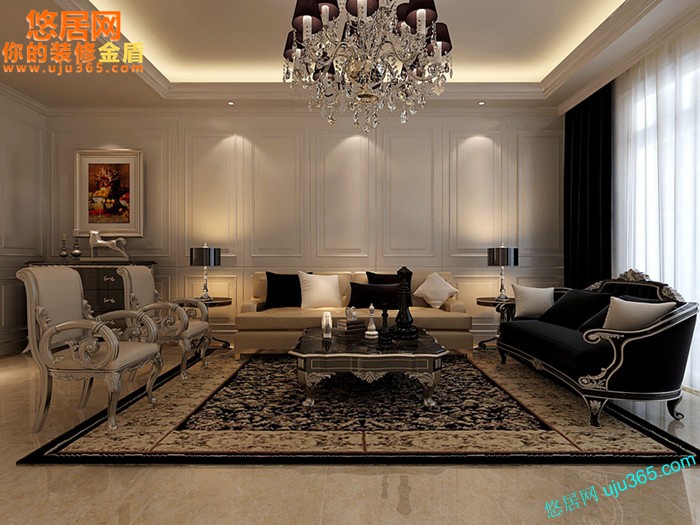 細(xì)節(jié)處理上注重雕花、線條,制作工藝精細(xì)考究。而客廳雖然不是金黃色的華貴,卻依然高貴。